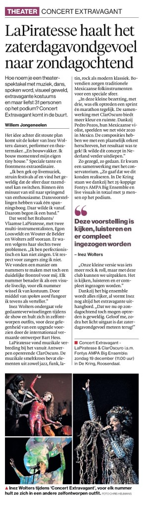 “Vanavond heb ik God ontmoet. Niet in een boek dat zegt hoe het moet. Niet in een goeroe of gebed, maar in de kunst. Want daar woont hij. Of zij. Wat was dit concert hemels! Om frontzangeres Inez Wolters te citeren: om te janken zo mooi! Wauw Wouter de Belder wat een arrangement! De opzwepende delen deden me denken aan concert in the Park, van Paul Simon (Diamonds on the soles of her shoes. Die energie)….enne Inez voor stadsdichter! Mooie relevante en schone teksten. Poëtisch, tijdloos en zonder opsmuk! Heel gaaf en broodnodig in deze akelige tijd!”